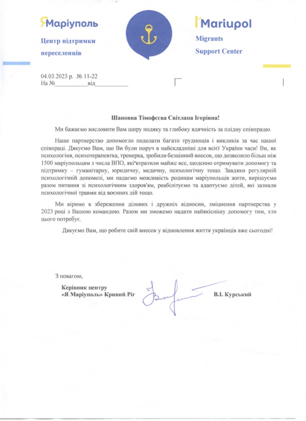 Надання психологічної підтримки маріупольцям які знаходилися у м.Кривий Ріг, та відвідували центр «Я – Маріуполь» з вересня 2022 року до липня 2023 року.